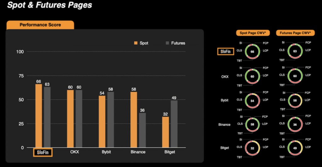 BloFin’s technical performance stands out in the crowded exchange landscape. According to its April 2025 technical report, BloFin’s trading system outperforms many top-tier exchanges in speed, stability, and efficiency. Notably, its homepage scored 86 on Google PageSpeed, outpacing OKX, Binance, Bitget, and Bybit. The spot and futures trading pages also scored higher than major competitors, ensuring a smooth and responsive experience even during peak trading.