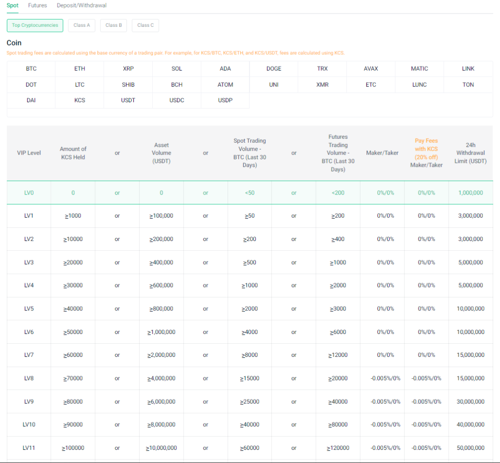 KuCoin trading fees for Spot and Futures are based on different Tiers. The maker/taker fees on KuCoin vary depending on the trading level and the classification of the coin being traded. Cryptocurrencies on the exchange are categorized into three classes: Class A, Class B, and Class C.