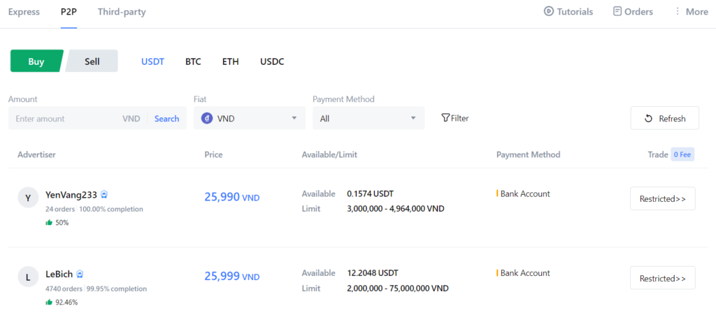 This can be done using payment platforms that include bank accounts, MoMo, ZaloPay, and ShopeePay-SEA. MEXC promotes P2P transactions without charging any fees. You can conduct these trades by selecting your preferred price and payment method, completing the payment to the seller, and then obtaining your selected cryptocurrency.