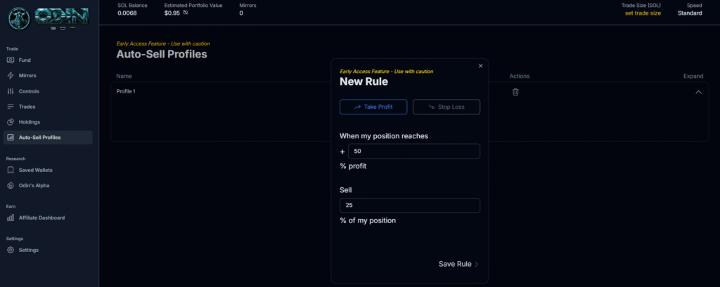 - Connect & Fund: Sign up via app.odinbot.io and fund your account with SOL.