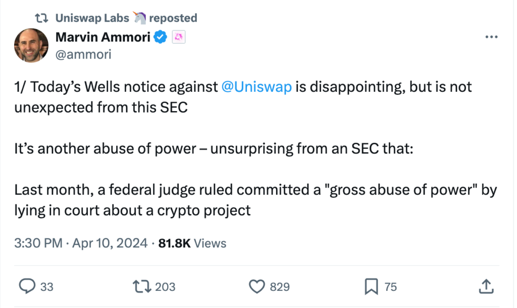 On X (previously known as Twitter), Uniswap’s head legal advisor Marvin Ammori acknowledged the regulatory body’s formal warning on April 10. “The Wells notice we received concerning Uniswap today is a letdown, though it’s hardly surprising given the current SEC,” Ammori penned, making the case:
